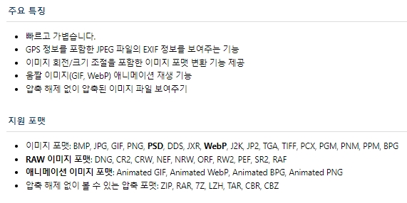 주요특징을 보시면 일단 빠르고 가벼우며, GPS 정보를 포함한 JPEG 파일의 EXIF 정보를 보여주는 기능을 제공합니다. 이미지 회전이나 크기조절을 포함한 이미지 포맷 변환기능도 제공하며, 움짤이미지 애니매이션 재생기능도 있습니다. 또한 압축해제 없이 압축된 이미지 파일 보여주기도 가능합니다. 지원포맷 전체 종류에 대해서는 위의 그림을 참고하세요.