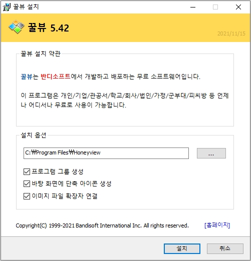 이제 저도 설치 진행을 해보겠습니다. 다운받은 인스톨 파일을 실행하여 진행할 수 있으며, 설치약관부터 확인이 가능합니다. 어디서든 언제나 무료사용이 가능하다고 하니 안심하고 이용할 수 있겠네요. 설치옵션에서는 저장위치, 프로그램 그룹생성, 바탕화면에 단축아이콘 생성, 이미지파일 확장자 연결에 대한 여부를 결정할 수 있습니다. [설치] 버튼을 눌러서 인스톨 후 실행할 수 있습니다.