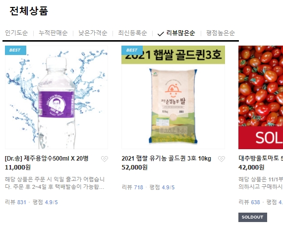 그럼 임의로 상품 하나를 선택해보도록 하겠습니다. 다양한 카테고리가 있지만 저는 전체상품을 기준으로 조회해보았습니다. 정렬기준은 인기도순, 누적판매순, 낮은가격순, 최신등록순, 리뷰많은순, 평점높은순이 있는데요 리뷰많은순으로 정렬하니 제주용암수 500미리 20병이 1등이고 햅쌀 유기농 골드퀸 3호 10키로짜리가 2등이네요.