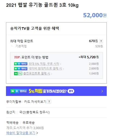 2021 햅쌀 유기농 골드퀸 3호 10키로그램 짜리의 경우 현재 52000원에 판매하고 있으며, 최대로 적립할 수 있는 포인트는 670원입니다. 포인트를 더 받는방법이 세가지로 안내되어 있으며 5720원까지도 받을 수 있네요. 택배는 무료배송이지만 제주나 도서지역은 추가비용이 발생할 수 있습니다. 그럼 해당 쇼핑몰에세 제공하는 다른 상품들도 확인해보시구요, 저는 이만 글쓰기를 마치도록 하겠습니다.