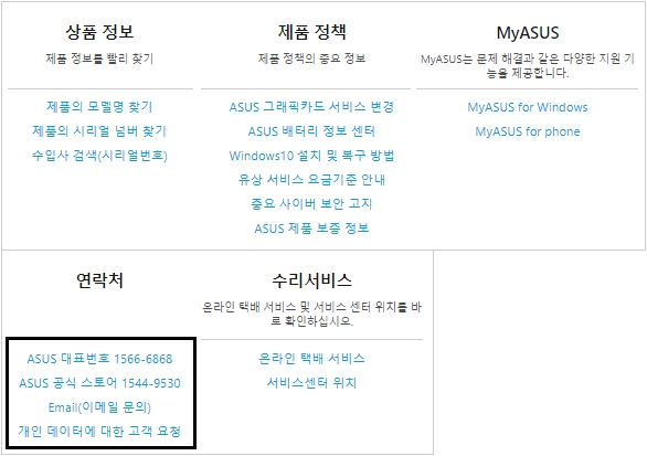 상품정보, 제품정책, MyASUS, 연락처, 수리서비스에 대한 안내가 되어있는데요 원하는 메뉴를 선택하여 상세페이지를 열 수 있습니다. 연락처의 경우 ASUS 대표번호와 공식스토어, 이메일문의, 개인데이터에 대한 고객요청을 할 수 있어요.