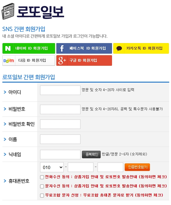 로또일보 계정을 만들어서 가입하는 경우 아이디, 비밀번호, 이름, 닉네임, 휴대폰번호를 입력하여 가입할 수 있습니다. 전화수신 동의 문자수신 동의, 무료조합 문자 신청 옵션을 설정할 수 있어요.